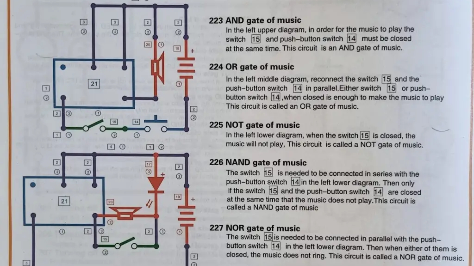 The W335 was an amazing experience to play with as it had many fun activities and I could experiment with each of the pieces. The W335 is a circuit-making set in which there are plastic/metal pieces that can be clipped together to create different types of circuits. There are many circuits illustrated and explained in the booklet, but it was more fun to experiment with the pieces to try and make more circuits. Below are three different circuits that I made from the booklet. They are labelled 1-5 in difficulty, with 1 being easy and 5 being hard.
