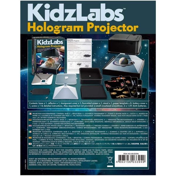 4M Kidz Labs Hologram Projector: This allows kids to discover the science behind the magical 3D hologram and how it is displayed as a fully three-dimensional image. Rotate the lightbox to see different views of each hologram! Excite your friends as you observe the included 3D images come to life, from astronauts floating in space to predators of the sea. You can view different themes by changing the template! You can even project your own images in your smart devices into holograms! For the best visual effect, It is recommended to view your images from a low angle in a darkened room. Please note: You will need to download a generic app for holograms to view them on your smart device. To view each animation place the 4-sided screen at the centre of your screen. A great toy to use in the dark. 4M – Kidzlabs Hologram Projector: Learn the theory behind the magical 3D hologram and impress your friends with the 3D images. Observe 3D images come to life.