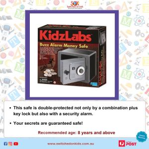 4M KidzLabs Money Safe Kit lets children build their own double-protected money safe by connecting a buzz alarm circuit and a simple dial lock. Children can store their pocket money or top secrets inside. Their valuables are under safe protection. You can build your own double-protected money safe by connecting a buzz alarm circuit and a simple dial lock. Store your pocket money or top secrets inside.