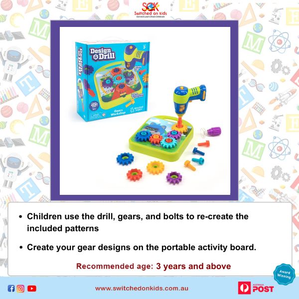 Children use the drill, gears, and bolts to re-create the included patterns or create their own custom pictures and designs.