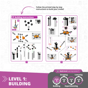 When they’re done experimenting, kids can take off their hard hats and pick up their colored pencils and decorate their very own snap-on skins. Plus, young learners will get a colored booklet with a micro-history of Newton’s laws and the theory behind them, fun STEM experiments with their very own crash test rig, a quiz to test their understanding of key STEM concepts, easy-to-follow building instructions, and printable skins to practice their design skills.