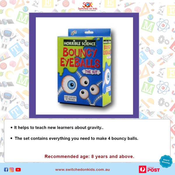 This Horrible Science Bouncy Eyeballs Set is a fun way to teach new learners about how balls bounce. It comes with everything you need to create your own bouncy balls as well as information sheets to help you understand how they work.