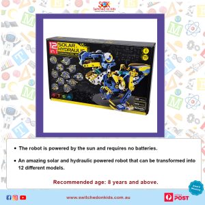 Building robots have never been so much fun! With the 12 in 1 Solar and Hydraulic Construction Kit, you can create and transform your robot into 12 different animals and vehicles using the power of solar and water! Combining STEM (Science, Technology, Engineering & Mathematics) ideas and processes, the solar and hydraulic construction kit allows children to explore and learn the benefits of alternate energy, including the functional mechanisms involved in robotic movement and modeling.