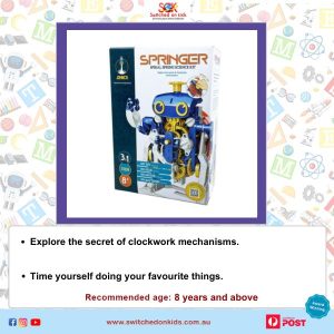 Spring Timer – the spiral spring works with low-speed escapement, performing as a 6-minute countdown timer with ticking sound. Time yourself doing your favourite things. This helpful timer won’t let you forget to have some fun. This innovative science kit is a fun to build and environmentally-friendly toy. No motor, batteries or screws are required – it is all powered by the plastic spring.