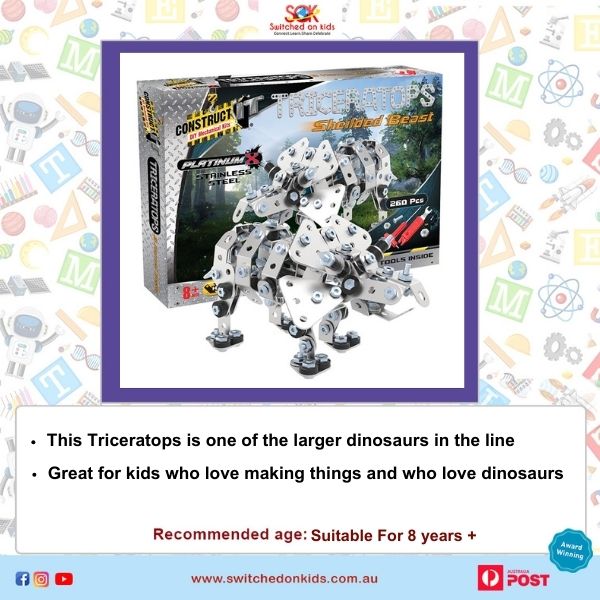 Prehistoric – Triceratops Shielded Beast – 260 Pces: The Triceratops is like a walking tank and this Construct It Platinum X Triceratops really does show this. Children can have a ton of fun as they bring to life this prehistoric beast piece by piece.