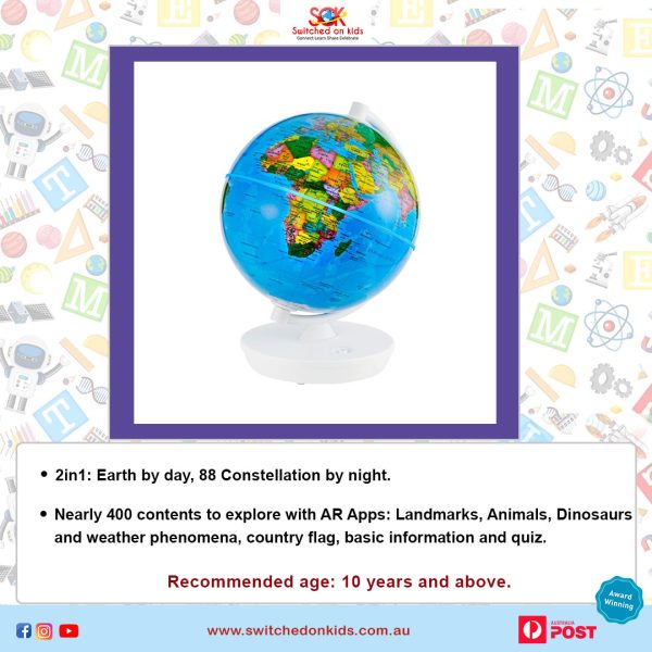 Oregon Scientific SmartGlobe Starry: Globe brings the entire universe right to young adventurers’ houses By day, this AR Globe is an interactive Earth that kids can play and learn with 3D Augmented Reality in 4 models: Animals, Landmarks, Dinosaurs, and Weather. By night, it magically turns into a luminous globe, revealing 88 constellations in a starry night.