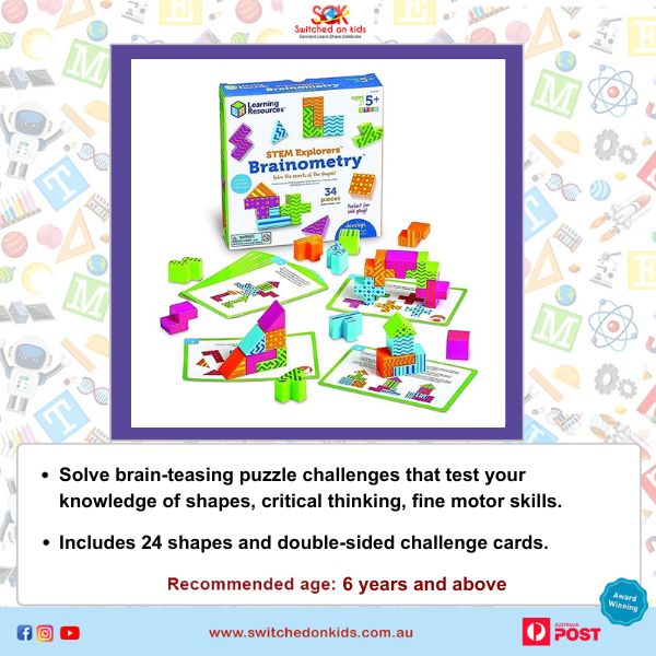 Get your brain in shape with these STEM puzzle challenges Kids solve brain-teasing puzzles that test their knowledge of shapes, critical thinking, fine motor skills, and more every time they play with STEM Explorers Brainometry from Learning Resources. Explore this set’s 10 STEM challenge cards for critical thinking puzzles that turn shape pieces into the 2D and 3D building blocks of victory! Manipulate six different shape pieces into solutions that require a keen eye for stacking, sorting, and geometry.
