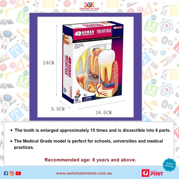 Triple Root Molar Model: It is used for anatomical and dental study and disassembles into three parts for effective demonstration. The tooth is enlarged approximately 15 times and is dissectible into 6 parts. Human upper triple-root molar with cavities model for anatomical and dental study. It comes with a display platform, 23 separate pieces, a brightly coloured model, Detachable organs with cross-sectional parts and internal details.